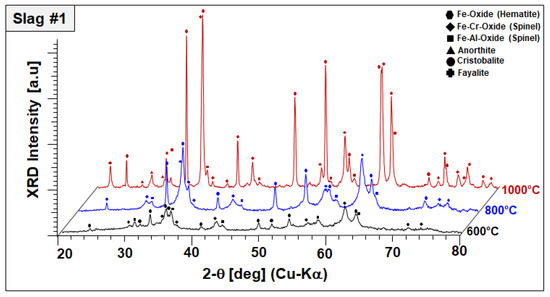 As a general observation, Figure 5 reveals the disappearance of amorphous humps and peak broadenings observed in the as-received condition (see Figure 2); both slags appear fully crystalline at 800 °C. As-received materials, which were produced by water-granulation of melts, are evidently far away from equilibrium and annealing at moderate temperatures provides sufficient activation energy and diffusion kinetics for the progressive crystallization of equilibrium phases. In slag 1, comprising fayalite and a spinel-type Fe–Al oxide in the as-received condition, the formation of hematite (Fe2O3, ICDD #33-0664) and a further spinel solid solution with lattice parameters close to chromite (FeCr2O4, ICDD PDF #34-0140) were observed after sintering at 600 °C. Again, in order to discriminate this spinel phase, it is referred to as “Fe–Cr spinel” in the following although its stoichiometry will presumably incorporate all matching cations. A significant decrease in the fayalite-corresponding peaks indicates the oxidation of fayalite into those more stable phases. After sintering at 800 °C, the final phase composition does not exhibit fayalite but better crystallized hematite and Fe–Cr spinel peaks have been noticed. After sintering at 1000 °C, well-crystallized hematite, and Fe–Cr spinel were found in the structure indicated by well-defined high-intensity peaks. Moreover, the first appearance of corresponding diffraction peaks points to the crystallization of small amounts of cristobalite (SiO2, ICDD PDF #39-1425) and anorthite (CaAl2Si2O8, ICDD# 41-1486) at elevated temperatures. The initial-phase Fe–Al oxide can still be found, indicating its higher temperature stability compared to fayalite. This temperature-dependent phase evaluation points out that the peak at 568 °C observed in the DSC signal is corresponding to a fayalite-to-hematite reaction triggered by the oxidation of Fe2+ to Fe3+. Moreover, the formation of the Fe–Cr spinel, cristobalite, and anorthite is linked to further exothermic signals recorded up to 1000 °C.
