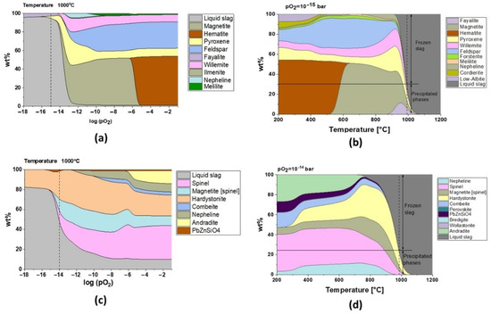 Phase formation as a function of (a) pO2 for slag 1 (at 1000 °C), (b) temperature for log (pO2) = −15 bar for slag 1, (c) pO2 for slag 2 (at 1000 °C), and (d) temperature for log (pO2) = −14 bar for slag 2.