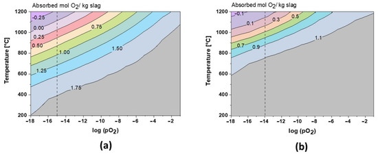 Theoretical O2 absorption in slag 1 (a) and slag 2 (b).