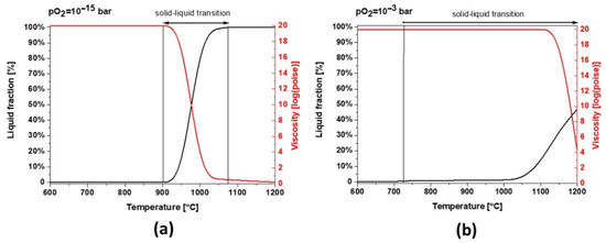 Thermodynamic modeling of liquid fraction and viscosity for slag 1 (a) pO2 = 1 × 10−15 bar and (b) pO2 = 1 × 10−3 bar.