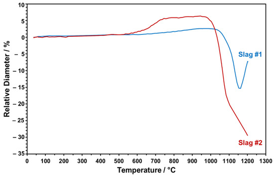 Slag 2 depicts a similar behavior to slag 1. However, due to its different chemical composition, mainly a lower content of Fe, this sample can absorb less oxygen and the slag exhibits a broad solid–liquid transition and a higher melting point at industrial conditions (see Figure 10a). As shown in Figure 10b, the melting point increases under more oxidative conditions but the formation of liquid/glassy phases is several times higher than slag 1, comparing the temperature range of 800–1000 °C, which is also consistent with the calculated 95 wt.% amorphous content obtained by Rietveld profile fitting. These wide transition ranges can be physically translated into more significant glassy phases and a completely different dilatation and thermal behavior.