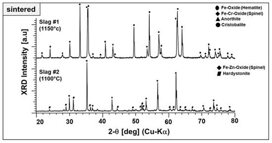 In Section 3.1.2, we performed a parametric study regarding the phase components at elevated temperatures up to 1000 °C. However, in the light of optical dilatometry results, higher temperatures than 1000 °C were applied for the sintering of slag particles to ensure well-consolidated end products. Therefore, slag 1 particles and slag 2 particles were also investigated after sintering at 1150 and 1100 °C in terms of their final phase mixture, as given in Figure 12.