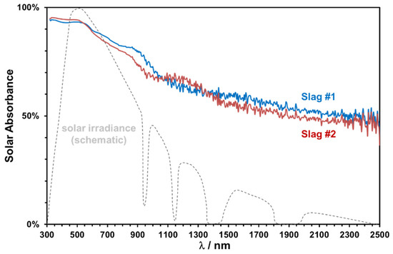 The absorptance spectra in the range of 320–2000 nm of two slags sintered at 1000 °C for 2 h are plotted in Figure 16, along with a schematic representation of the normal solar irradiance. Both slags exhibit a good absorptance in the important spectral range between 400 and 900 nm.