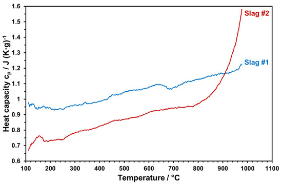 Temperature-dependent heat capacities of both slags sintered at 1000 °C were measured within 3 cycles up to 1000 °C. The measured values were averaged and plotted as given in Figure 17.