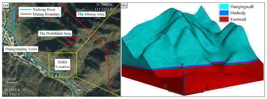 Dingxi Mine is located in Zhangcunping Town, Yichang City, Hubei Province, China. The steep and high mountains that surround Zhangcunping Town form several HSRS, threatening nearby residents. Dingxi Mine used to adopt the open-stope method for mining. Therefore, to ensure the safety of nearby residents, nearly 6.3 million tons of high-grade phosphate ore near Zhangcunping Town was designated a prohibited area, shortening the service life of Dingxi mine and affecting the economic benefits. Subsequently, the mine plans to select appropriate mining methods to safely recover this part of the ore. To verify the feasibility of safe mining, the stability and reliability of a 2D section were previously studied for a typical HSRS, and the results demonstrated that the stability and safety of the HSRS could be ensured under backfill mining []. In order to more closely reflect the situation of the HSRS, a true-3D model was used to simulate and analyze the HSRS with different underground mining methods. Due to the large number of HSRS in the restricted area, the slope which best reflects the slope instability was selected for analysis: a typical fundamental HSRS located in the southeast (just 200 m away from the residential area, Figure 1a).