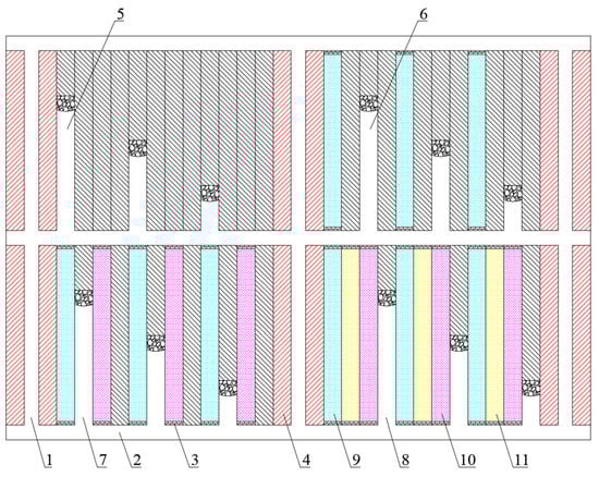 (Source elaborated by authors) Schematic diagram of the dynamic mining process of FITBMM. 1—Connection rise entries; 2—Haulage drifts; 3—Backfill blocking walls; 4—Spacer pillars of the panel; 5—1st step mining tunnels; 6—2nd step mining tunnels; 7—3rd step mining tunnels; 8—4th step mining tunnels; 9—1st step backfill; 10—2nd step backfill; 11—3rd step backfill.