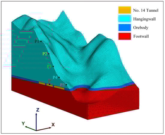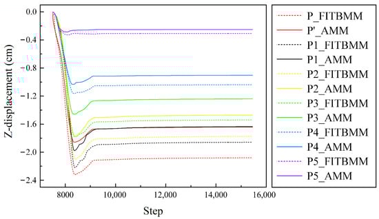 In order to more intuitively observe and compare the influence of these two mining processes on the surface and stope roof, five surface displacement monitoring points (points P1–P5, Figure 5) were set in the section where Tunnel 14 is located, and two roof displacement monitoring points were also set on the roof of each stope for the two mining methods (point P for the FITBMM, Figure 2a; point P’ for the AMM, Figure 2b and Figure 5). These seven displacement monitoring points recorded the Z-displacement of the two mining methods, from the initial equilibrium state at the beginning of mining, to the final equilibrium state after mining.