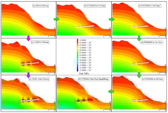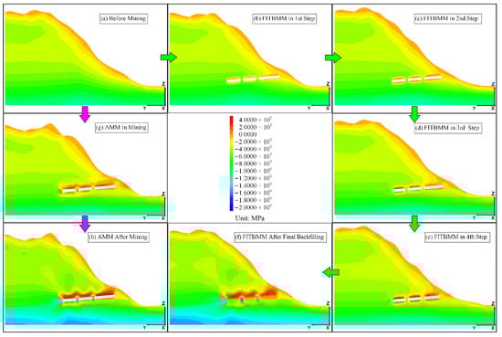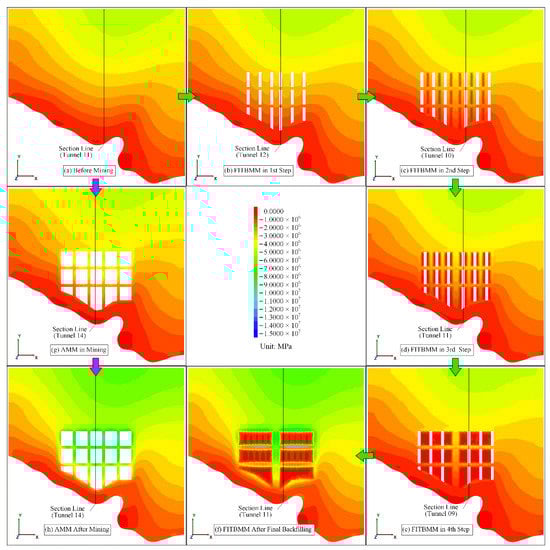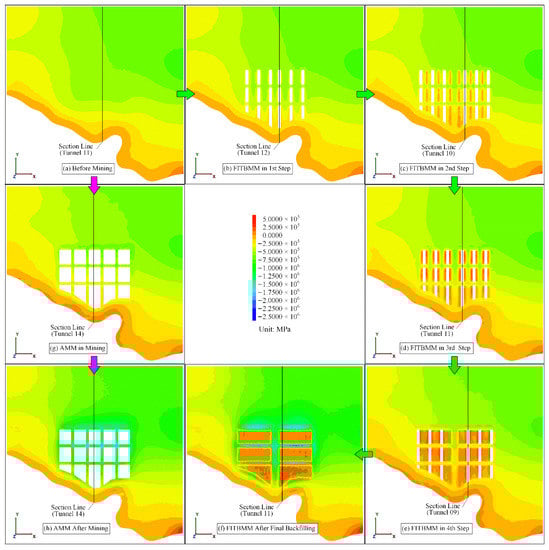 - Similarly to the maximum principal stress, during each mining step of FITBMM, due to the effect of the cemented backfill on both sides of the tunnels, the changes of the minimum principal stress distribution of the representative sections are not obvious (Figure 9b–e and Figure 10b–e); but the compressive stress concentration phenomenon has already emerged, with the pillars in the intermediate state of AMM (Figure 9g and Figure 10g).