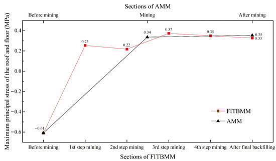 (Source elaborated by authors) The maximum principal stress of the roof and floor of FITBMM and AMM on representative sections.