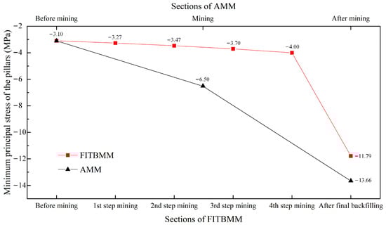 (Source elaborated by authors) The minimum principal stress of the pillars of FITBMM and AMM on representative sections.