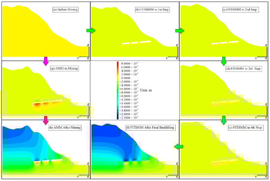 - In the final state (Figure 12h,f), the Z-displacement field gradually radiates upward and downward from the roof and floor; and the absolute value of the displacement keeps increasing, but the roof convergence of FITBMM is more obvious.