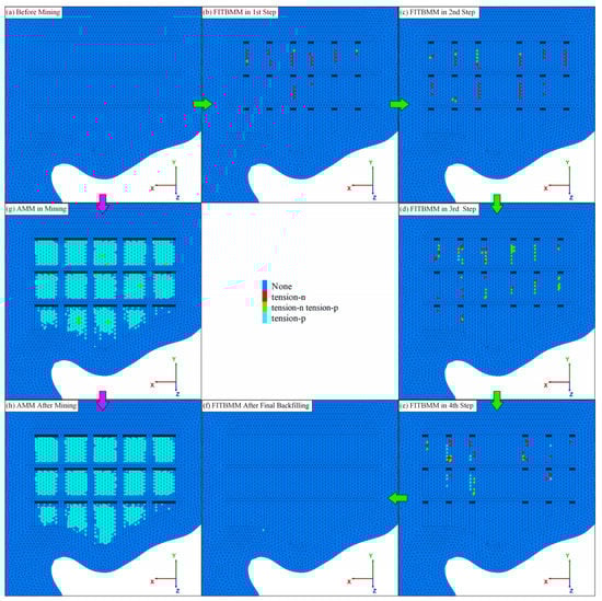 - For FITBMM, tensile failure units appear on the roof of the tunnels in the four intermediate states; among these, the roof failure units of the 1st and 2nd steps are sporadic, and the plastic zone is not interconnected (Figure 14b,c); in the 3rd and 4th steps, a part of the roof has formed failure units, which has the risk of partial roof collapse (Figure 14d,e). For AMM, whether in the intermediate state or the final state, there is a large range of tensile failure units on the roof (Figure 14g,h).