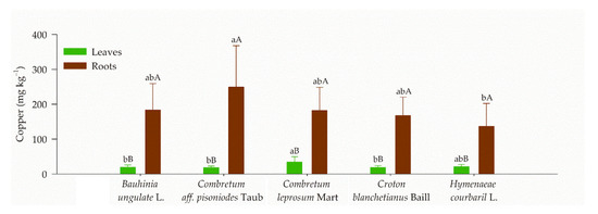 - Asensio, V.; Flórido, F.G.; Ruiz, F.; Perlatti, F.; Otero, X.L.; Ferreira, T.O. Screening of native tropical trees for phytoremediation in copper-polluted soils. Int. J. Phytoremediation 2018, 20, 1456–1463. [Google Scholar] [CrossRef] [PubMed]