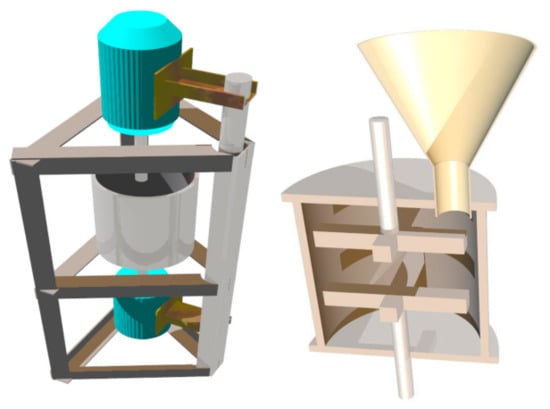 Following promising results obtained in a single impeller crusher that involved repeated crushing of the product [], the crusher design was improved by introducing a second impeller so that particles encounter two comminution stages before descending to the bottom of the device. Before implementing the new design, a prior investigation of the performance to be expected with this new design was made using the DEM tool.