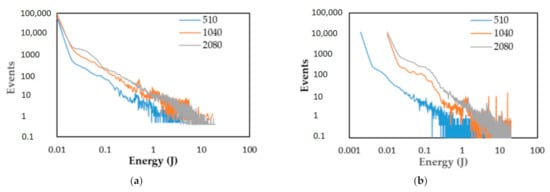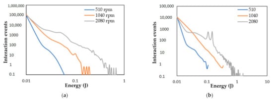 The evaluation of the impact crusher’s performance was based on the recorded energy dissipation in each of the iteration events in the simulated period. As pointed by Cleary and Sinnott [], the energy spectra can be used to characterise a comminution environment and show how design changes or operational mode can influence expected performance. The changes in the energy spectra were assessed under different modes of operating the impact crusher. The scenarios explored involve: effect of rotor speed, particle size effect and rotor configuration. To compare simulations of different time durations, all the events were normalised to a time duration of 1 s.