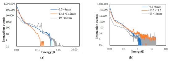 The rotor speed of 1040 rpm was used to investigate the effect of particle size on the number of impacts achieved and the energy associated with those impacts. The energy spectra of the collisions of the particle size ranges for single and double impellers are presented in Figure 4. Three sizes, −19 + 16.7 mm, −13.2 + 11.2 mm, and −9.5 + 8 mm, are compared for both single and double rotors. While the total number of events is roughly in the ratio 25:7:1 for big: medium: smallest sizes, respectively, as expected due to particle numbers involved, the distribution of the energy levels is however surprising. For single-rotor speed, the −9.5 mm + 8 mm size range displays more higher energy events than the −13.2 + 11.2 mm, while for the double rotor, the −13.2 + 11.2 mm seem to have the highest energy events. Though the reason for this is no clear, it is possible that the relative spacing of the rotors on the shaft might affect particle collisions differently and future simulations and experiments should investigate optimal rotor spacing for specific particle sizes.