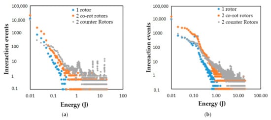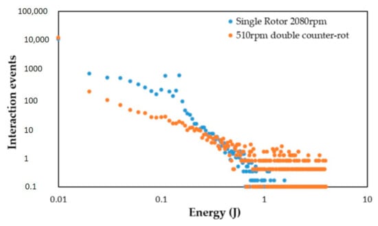 Instead of the one rotor that was initially used in the previous experiments [], a second counter-rotating rotor was introduced in the simulation to determine if this design would enhance overall performance. Figure 5 shows how the single rotor energy spectra compare with the double rotor’s spectra, for particle size −13.2 + 11.2 mm at 1040 rpm and 2080 rpm. For both speeds, the first simulation comprised one rotor at the set speed followed by two counter-rotating rotors at that speed. The observed improvement is phenomenal, especially in terms of the number of events with energy above the threshold level.