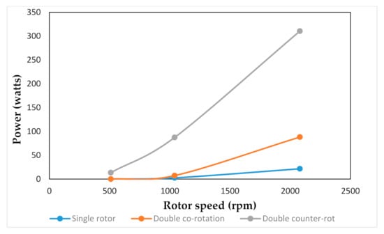 Comparison of the single rotor with double co-rotated and double counter-rotated rotors at (a) 1040 rpm and (b) 2080 rpm.