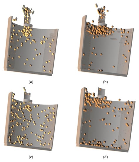 The entity contact laws were based on the linear spring-dashpot model, with the normal stiffness and shear (or tangential) stiffness parameters being based on previous work done by Bwalya []. Table 1 shows the parameters used. The simulations time step was based on Equation (1) using the smallest particle in the system []: