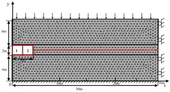 It is assumed that the physical properties, gas parameters, and stress distribution of coal seams along each section of the driving face are the same. The geometric model of the numerical solution was simplified to a horizontal (x and y) two-dimensional plane model. The model size was 2.2 m in thickness of the coal seam, 6 m in the height of roof and floor, and 30 m in length. Coal and gas outburst induction was realized through two-step excavation, with excavation distance of 1.5 m at each step (Figure 2). The bottom end is fixed and the horizontal displacement is fixed on the left and right sides. The initial gas pressure in the coal seam is 0.5 MPa, and only the gas migrates in the coal seam. In addition, in order to obtain the response laws of the stress–strain field and the gas and temperature fields, the model uses a number of solid modules to carry out one-step mining to obtain the initial stress–strain field and disturbance stress–strain field, and uses a PDE module to solve the gas field and temperature field. Solid module: the upper boundary is a constant load boundary. The initial ground stress in the physical model is 16 MPa, and the initial load in the numerical model is also a constant load of 16 MPa. The lower boundary and the right boundary are roller boundaries, and the exposed surface formed after excavation is the free boundary. PDE module: the upper and lower boundaries and the right boundary of the coal seam are zero flow boundaries. Gas can only move in the coal seam, and the initial coal seam gas pressure is 0.5 MPa; the exposed surface after excavation is a constant pressure boundary, and the pressure is atmospheric pressure. The specific parameters in the model are shown in Table 1.