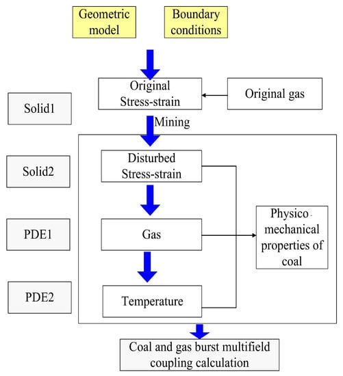 The numerical solution of coal and gas outburst is an operation of multiple physical fields, including the stress field, gas pressure field and temperature field. Moreover, there are coupling relations among each physical field. The internal solid mechanics field is used to calculate the stress–strain relationship of coal–rock mass; the flow field of gas in coal is selected to calculate the flow field, the mechanical effect of gas on the coal body is applied by the volume force in the solid mechanics field, the yield of the coal body is calculated by the D–P matching criterion, and the steady-state solution is used in the calculation process, as shown in Figure 3.
