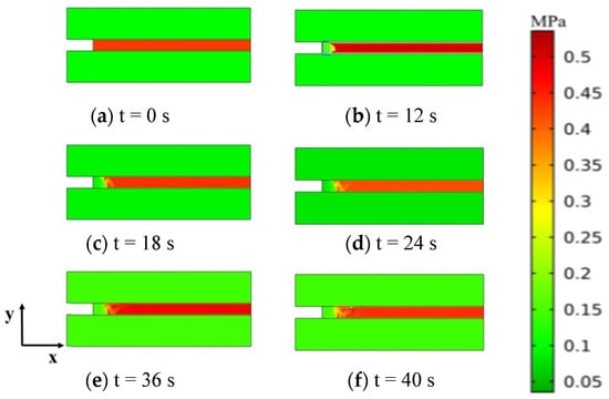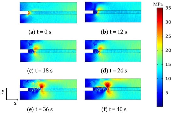 Figure 4 shows the stress field response at different time nodes in the process of outburst. The colors of different areas in Figure 4 represent different degrees of failure in different areas of coal. Figure 4a indicates the stress balance state near the working face after two steps of mining before outburst. The work of stress on coal increases the elastic potential of coal, which leads to the accumulation of high elastic energy and the expansion of coal cracks, providing conditions for the instantaneous gas release at the working face front. At the 12th s, the change rate of stress field accelerates, so it can be judged that the outburst occurs at this time. As can be seen from Figure 4b, after the occurrence of coal and gas outburst, the stress in the model begins to unload, and the coal body suffers tensile failure. The stress at the front of the working face has been completely unloaded, the vertical stress value has been approaching zero, the stress concentration has shifted. Meanwhile, the stress concentration has shifted to greater depth. The stress concentration area moved to the position 3–5 m from the outburst, and the stress concentration area of the roof and floor present a symmetrical distribution. Figure 4c–e is, respectively, 18, 24, and 36 s in the process of outburst. The coal body continues to be damaged, and the strength of coal is completely lost or decreased. The vertical load is also transferred to the coal body in the outer undamaged area. After 40 s, the stress field is stable and the stress no longer changes (Figure 4f).