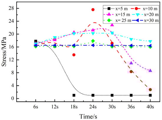 Figure 5 illustrates the stress curve at different distances from the coal wall. It can be concluded from Figure 5 that stress response is fastest at x = 5 m and x = 10 m, nearest to the coal wall. There is a negative correlation between stress and time at x = 5 m, which indicates that the coal nearest to the outburst is thrown out first, and the ground stress decreases rapidly and approaches zero. The stress curve at x = 10 m indicates a trend of rapid decline after increasing to a maximum value of 17.5 MPa. The stress at x = 15 m, x = 20 m and x = 25 m rise and then tend to be stable with the development of outburst.