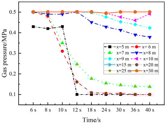 Figure 6c–e shows the outburst development stage in which the gas keeps pouring out to the roadway; the gas pressure in the coal body continues to decrease, and the gas pressure gradient is formed in the outburst hole. At the same time, gas pressure has multiple ”jump zones”. Figure 6f demonstrates the outburst termination stage. At this time, there is still continuous gas desorption, but the rate of gas pressure drop has reduced significantly. Although the gas is still continuously desorbed, it is not sufficient to support the continuous occurrence of coal and gas outburst, and the gas internal energy accumulated by gas desorption cannot throw coal. Therefore, not all desorption gas is involved in coal and gas outburst work. Only the energy that can participate in tearing, throwing, and transporting coal does work to outburst. That is the initial gas expansion energy. Figure 7 reflects the variation trend of gas pressure over time at different distances from the coal wall. After the outburst occurred, the coal body near the outburst was destroyed and thrown out under the action of the stress field and gas pressure field, and the gas pressure in the coal body changed violently.