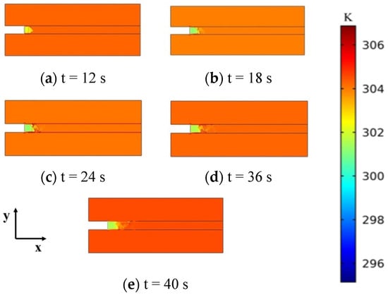 From the point of view of the whole process of outburst, the temperature drop is the most obvious during outburst and the temperature drop rate is the largest, with a drop of 9 K, at the beginning of the burst. As the broken coal is thrown out, the temperature near the outburst begins to change, decreasing from 306 to 303 K, shown in Figure 8 and Figure 9. To some extent, the change of coal temperature reflects the development and suspension of the outburst. In the process of continuous outburst, the temperature field shows a continuous decrease. When the gas pressure rises and the gas compresses, the temperature presents a slight rise. On the other hand, the temperature variation reflects the whole process of the outburst. Therefore, it can also be interpreted that the change of temperature field reflects the change of the stress field and gas pressure field. In the process of outburst, the decrease of temperature in coal is mainly caused by the work of gas expansion in the coal and the heat absorption and desorption of gas.
