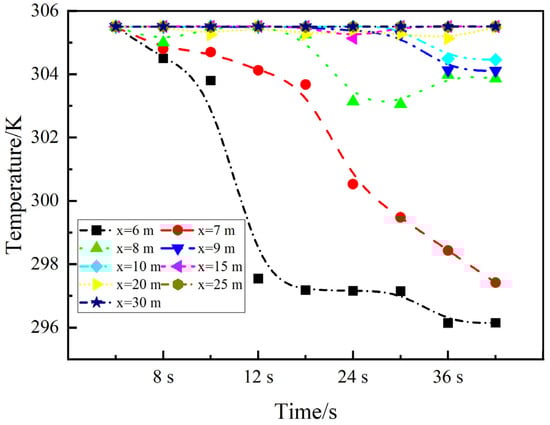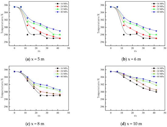 Figure 13 shows the temperature response in the process of coal and gas outburst under different stress conditions, and Figure 13 illustrates the response law of temperature at 5, 6, 8, and 10 m from the origin of coordinates on the central axis of coal seam. Under different stress conditions, the temperature response has the same variation trend after outburst, which shows that the temperature curve decreases rapidly after outburst. After about 10 s, the temperature curve decreases at a slower rate. When it reaches 20 s, the curve basically remains stable and no significant decline occurs. It indicates that the gas adsorbed in the pores of the coal body begins to desorb, leading to a rapid drop in coal body temperature, and the expansion of a large volume of desorbed gas also needs to absorb a large amount of heat, so the temperature of the coal body drops significantly after outburst. The response of the temperature field, stress field, and gas pressure show corresponding phenomenon. The temperature field responds strongly in the early stage of outburst, and the temperature drops rapidly. The corresponding stress field and gas pressure field also show rapid stress transfer and the gas pressure decreases.