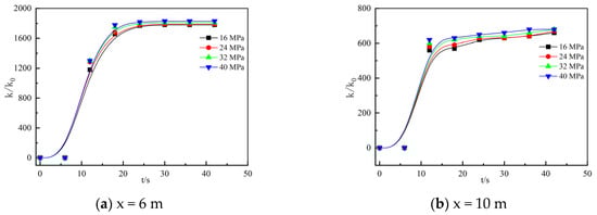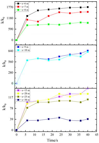 Figure 14 shows the permeability response in the process of coal and gas outburst under different stress conditions, and Figure 14 illustrates the response law of permeability distribution at 6, 10, 15, and 25 m from the origin of coordinates on the central axis of coal seam. The permeability is negatively correlated with the increase of the distance from the outburst port. The permeability area in front of the working face affected by coal and gas outburst can be divided into three areas: sudden increase, medium growth, and growth. The sudden increase area is in the main pressure relief zone, and the coal body has been highly broken and fissures developed under the influence of the outburst. The medium growth area is mainly distributed in the stress concentration area, part of the coal has broken, but it can still support the coal. The growth area is far from the outburst port, and the number of fractures produced by the coal body under the influence of outburst has been greatly reduced, leading to the weakening of the growth range of permeability. However, the gas can still provide energy for outburst by continuous desorption in the process of outburst.