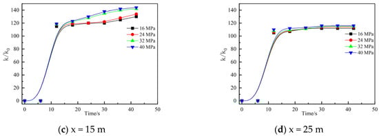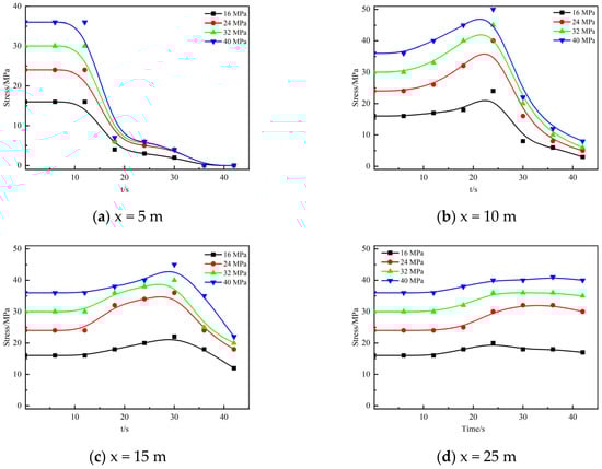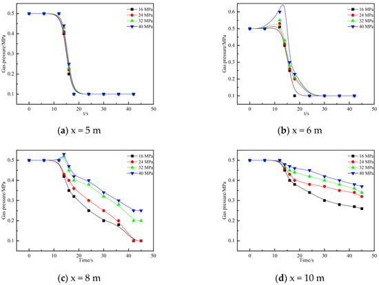 Figure 11 shows the stress response during coal and gas outburst under different stress conditions. Figure 11 illustrates the response law of stress distribution at 5, 10, 15, and 25 m from the origin of coordinates on the central axis of the coal seam. In the process of coal and gas outburst, when the initial ground stress is 16, 24, 32, and 40 MPa, the response trend of ground stress is consistent. Figure 11a shows the broken coal is thrown out and the stress shifts rapidly after the outburst. The ground stress drops rapidly from 16, 24, 32, and 40 to 0 MPa. From the point of view of stress response rate, the initial ground stress decreases from 16, 24, 32, and 36 MPa to 4, 6, 7, and 7 MPa, respectively, in the range 12–18 s. Stress response rates are 2, 3, 3.8, and 4.8 MPa/s, respectively. It can be found that the higher the initial ground stress, the higher the stress response rate after outburst. Figure 11b,c respectively, shows the response law of stress with outburst development under different stress conditions at x = 10 m and x = 15 m. It can be seen that stress concentration stage and stress release stage are experienced in the process of outburst. Figure 11d indicates the stress response law with outburst development under different stress conditions at x = 25 m. After outburst occurred at x = 25 m, the stress response was weak, and there is a small increase under different stress conditions, which generally remained stable.
