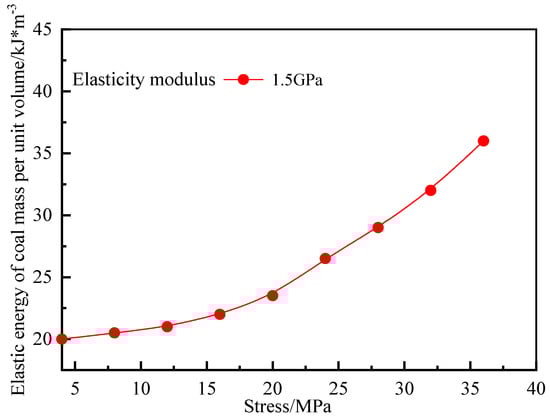 It can be seen from Figure 15 that the elastic energy per unit volume is positively correlated with stress. With the increase of stress, the elastic energy per unit volume of coal keeps increasing. When the elastic modulus of coal is 2.0 GPa, the stress increases from 5 to 35 MPa, and the elastic energy of coal mass per unit volume increases by 19.8 kJ/m3. Under the condition of high stress, the energy condition of coal and gas outburst can still be satisfied because of the high elastic energy of coal and rock mass, even if the gas extraction reaches the standard.