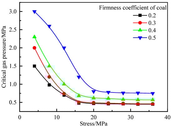 In order to explore the relationship between the critical gas pressure and stress of coal and gas outburst, the coal firmness coefficients are 0.2, 0.3, 0.4, and 0.5, while the outburst strength remains unchanged. It can be seen from Figure 17 that the smaller the coal firmness coefficient, the smaller the energy required for the occurrence of coal and gas outburst, specifically, the smaller the stress and gas pressure can meet the energy conditions for the occurrence of coal and gas outburst. The smaller the solidity of coal, the gentler the curve, and the less the effect of stress, while the sensitivity of gas is enhanced, and the energy source of coal and gas outburst is more dependent on the internal energy of gas. The critical gas pressure satisfying the energy condition of coal and gas outburst gradually decreases with the increase of stress, indicating that under a high stress condition, a small gas pressure can also satisfy the energy condition of coal and gas outburst.