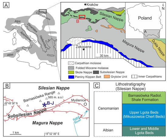 (A) A simplified geological map of the Alpine orogeny and its foreland, with marked area of the Western Central Carpathians [27] in its Polish part. (B) Detailed geological map of the studied area (a part of the Outer Carpathians after [28]) with location of the study area (Barnasiówka-Jasienica quarry; B–J). (C) Albian–Cenomanian lithostratigraphic scheme of the Silesian Nappe in the Outer Carpathians (after [29,30,31,32]).