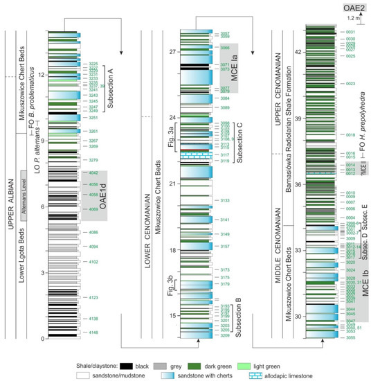 The Mikuszowice Chert Beds (MCB) are composed of mm to cm-thick siliciclastic to calcareous partly silicified, fine-grained flysch deposits, which represent predominantly Tbde intervals of the Bouma sequence (Figure 3D–G). The most striking feature of these deposits, visible only in thin sections, is the high content of siliceous sponge spicules. Other biogenic micro-constituents are planktonic and benthic calcareous foraminifera, inoceramid prisms and, sporadically, fragmented coralline algae and echinoid spines. Radiolarians are present in the MCB despite of the later diagenetic remobilization of biogenic silica and formation of bluish chert layers (summary in [18,22]). The carbon stable isotope analysis identified the upper part of the MCB corresponding to the Mid-Cenomanian event Ia and Ib (Figure 4) [32,49]. The uppermost part of this unit passes gradually into the lower part of the BRSF which differs from MCB by the lack of chert layers. The lower part of the BRSF (9.7 m thick) consists of thin- to medium-bedded (up to 25 cm) calciturbidites and siliciclastic silty and fine-grained sandy turbidites with intercalations of non-calcareous green and black, partly hemipelagic siltstones.