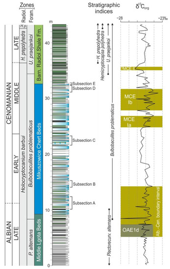 Lithological log of the Barnasiówka-Jasienica section, Silesian Nappe, Outer Carpathians plotted against the main radiolarian and foraminiferal stratigraphic markers, and δ13Corg curve containing a range of the main carbon isotope events (after [32]). The position of the subsection studied is also presented. U. praejankoi—Uvigerinaminna praejankoi Agglutinated Foraminifera Zone; H. p.—Hemicryptocapsa polyhedra Radiolarian Zone, H. prepolyhedra—Hemicryptocapsa prepolyhedra Radiolarian Zone.