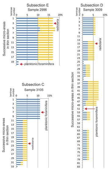 The percentage quantity of radiolarians and planktonic foraminifera on a background of all microfacies constituents have been counted in all of the 1750 micro-areas from selected subsections (A–E) in the section studied (Figure 11). The radiolarian never exceeds values of 3% in the subsections A–C. In the subsection D, their content increases up to 5% in samples corresponding to the MCE Ib deposits. Above this event, radiolarian quantity increases gradually, reaching a maximum value of 7.5% in the subsection E.