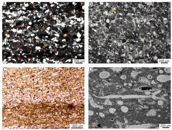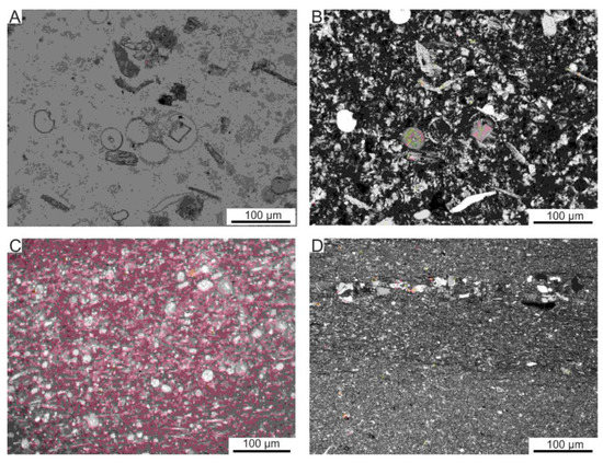 Previous lithostratigraphic, microfacial and palaeontological investigations showed the main features of these units and their stratigraphic position [21,22,31,32]. These are fine-grained turbidities consisting of detrital material mixed with biogenic particles, which are predominantly siliceous spicules of Demospongiae. This group is represented predominately by orders Lithistida, Hadromerida and Astrophorida [18]. Redeposited material is intercalated with hemipelagic non-calcareous shales (Figure 2 and Figure 3) which include, among the microfossils, only radiolarians and deep-water agglutinated foraminifera (DWAF). The numerous redeposited biogenic grains start to appear in turbidites from the upper part of the MLB but the huge mass of spicule-rich particles and other bio-clasts are the main components of the overlying MCB [21,22,32].