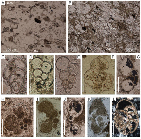 (A,B) Foraminiferal biomicrite dominated by trochospiral forms from the genus Hedbergella (H.d.) and biserial forms from genus Planoheterohelix (P.m); (A)—sample 2998, subsection E; (B)—sample 3115, subsection C. Redeposited planktonic foraminifera from biomicrites of turbidite layers in the Mikuszowice Chert Beds. (C–E) Planoheterohelix moremani (Cushman), (C)—sample J3105, (D,E)—sample 2996. (F–J) Hedbergella spp., (F)—sample J3205, (G)—sample J3001, (H)—sample J3015, (I)—sample J3199, (J)—sample J3208. (K,L) Rotalipora/Thalmannammina sp., (K)—sample J3227, (L)—sample J3001. Scale bar 100 μm for figures (D–L).