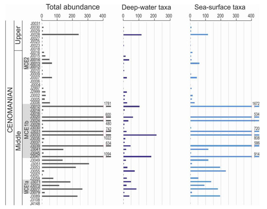 In modern environments that constitute the background for the interpretation of the studied fossil communities, some morphological features of planktonic foraminifera, such as test shape, occurrence of spines, wall structure including size and spatial density of pores, are partly related to adaptation (e.g., [59,60]). The distribution of this group of plankton is controlled mainly by temperature, salinity, trophic conditions, and additionally—by sunlight, and predation in the upper water column (e.g., [61,62,63]). They all have an influence on water depth preference for particular species, which shifts during ontogeny, and seasonal preference (e.g., [64,65,66]). The relationships described above were used in palaeoecological models for Cretaceous groups of planktonic foraminifera, taking into account their water depth habitat. Small, globular (Globigerina-like) forms have been included to the shallow-dwelling assemblage, whereas large, flattened taxa with developed ridge (Globorotalia-like) were attributed to environment with greater depths (e.g., [67,68,69]). This model had also biogeographic implication, that is, shallow-dwelling forms should dominate in the Cretaceous epicontinental seas, whereas more diversified assemblages containing the deep-dwelling taxa should represent pelagic setting (e.g., [70]). Nevertheless, further analysis of planktonic foraminiferal assemblages using oxygen isotope studies (summary in [71]) showed changes in depth preferences for many taxa during the late Albian and early Cenomanian. This concerns a rapid adaptation across the Albian–Cenomanian transition (ACT) of Rotalipora (Thalmanninella)-like taxa (Th. globotruncanoides (Sigal), Praeglobotruncana stephani (Gandolfi)) to living at a surface habitat [71] and the decline of surface-dwelling Paracostellagerina libyca (Barr). This vertical migration to greater depths occurred also in the early Cenomanian within the Hedbergella delrioensis (Carsey). The changes in adaptive strategy may, at least in part, be related to collapse of the upper water column stratification around the OAE1d, suggested in [72]; however, the reasons for this could be varied including warming of intermediate [73] or cooling of surface water during an interval that started at the ACT [71].