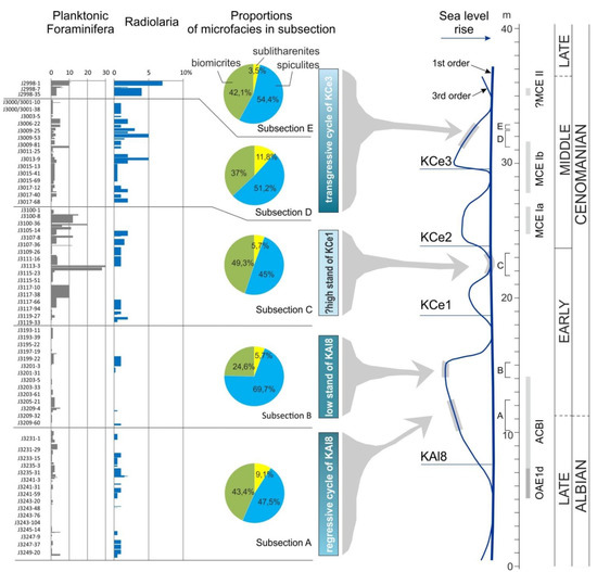 Our previous studies of the age of these sediments, based on analyses of carbon stable isotopes and micropalaeontological data, mostly related to abundance of sponge spicules [32] showed that the beginning of mixed siliciclastic and calcareous turbidites sedimentation, coinciding with the onset of increased supply of sponge spicules to the Silesian Basin, corresponds to the OAE1d. On this basis, we interpret that the sediments of the subsection A, partially corresponding to the youngest phase of the OAE1d, were accumulated at the beginning of a global regressive event KAl8 sensu Haq [1]. The proportion of microfacies, and above all the high content of biomicrites (on average 43.4%; Figure 11), indicate a relatively high sea level during the redeposition of calcareous micro-constituents from the shelf. This suggests that these sediments represent the early lowstand systems tract. Consequently, the overlying sediments of the subsection B are interpreted as accumulated during the maximum of regression, related to the same KAl8 sea-level cycle. This is evidenced by the particularly high content of spiculites among microfacies in sandy-silty turbidites (~70%), the highest in the entire succession studied (Figure 11). Additionally, the time interval that covers the accumulation of sediments from subsections A and “B” could correspond to the worldwide first-order regression cycle (discussion in [32]).
