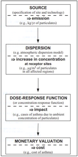 An illustration of the main steps of the impact pathways methodology applied to the consequences of air pollutant emissions. Each step is analyzed with detailed process models. Reproduced with permission from (Bickel, P.; Friendrich, R.), ExternE-externalities of energy-methodology 2005 update; published by (European Commission, Directorate-General for Research Sustainable Energy Systems, Luxembourg), (2005) [].