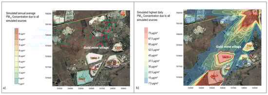Simulated highest annual PM10 (a) and highest daily PM10 (b) concentration due to all simulated sources [].