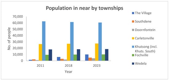 In this study, an assessment of the human health impact was conducted in the Merafong municipality which includes townships such as Carletonville, Khutsong, Wedela, Blybank, the gold mine village, Doornfontein, and Fochville, to name a few. The townships affected by dust from the TSFs considered in this study are shown in Figure 2. The townships were chosen to form part of the study, as they are near the dust generating TSFs in the area. The population sizes of all the affected towns are summarized in Figure 3 for the study period 2013–2017. The population size data were provided by the Merafong Municipality in 2018 [].