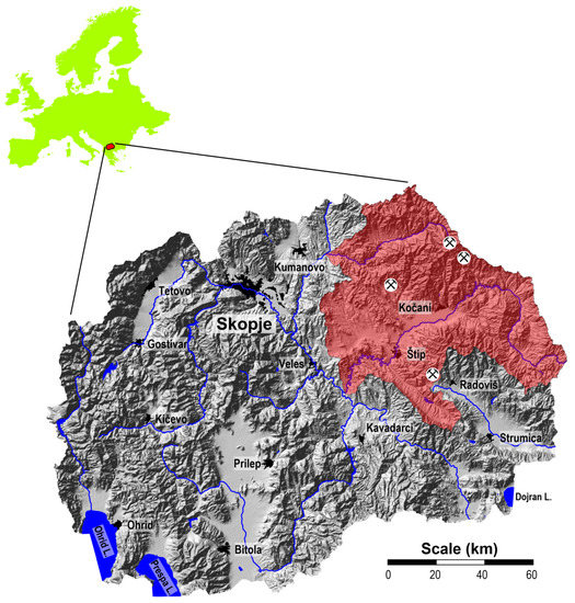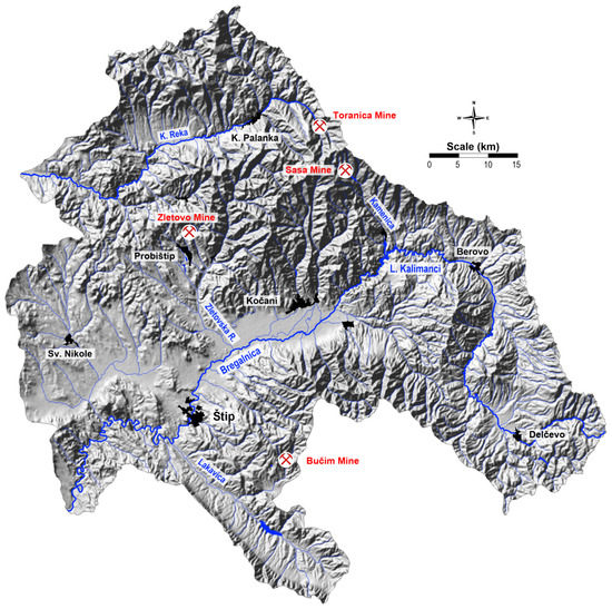 The investigation subarea of the Bregalnica River Basin covers an area of about 4300 km2 and 1110 km2 of the Kriva Reka Basin. In total, an area of almost 5400 square kilometers was included in this research (Figure 1). The Bregalnica River Basin occupies two valleys—the Maleševska and the Kočani Valleys. The Kočani Valley represents the middle course of the Bregalnica River and includes a significantly explored agriculturally area [29]. In general, the region is characterized by a moderate continental climate [29]. The average annual temperature is about 13 °C [29]. The most frequent winds are from the west, with a frequency of 199‰ and a speed of 2.7 m/s; the east winds have a speed of 2.0 m/s, with a frequency of 124‰, and have an important influence on the distribution of atmospheric dust [30]. This area is characterized by an average annual precipitation of about 500 mm and is regulated by Mediterranean cyclones. The subtropical anticyclone results in warm and dry summers, while the central area of the region is considered the driest. From there, due to the increasing influence of the Mediterranean climate or the increase in altitude, average annual precipitation increases in all directions [29]. The area of Bregalnica River Basin is characterized by several significant emission sources of potentially toxic metals, including the copper mine and flotation “Bučim” near Radoviš, the lead and zinc mines “Sasa” in the vicinity of Makedonska Kamenica and “Zletovo” near Probištip. Flotation of copper minerals produces about 3,950,000 tons of flotation residues annually [31], while at the Sasa mine this number is between 70,000 and 100,000 m3 [32,33]. In the flotation tailings of the Zletovo mine, it is estimated that the total amount of deposited dump is about 14 Mt [34]. The tailings are exposed to airflow, which leads to the dispersion of contaminated particles. In addition to wind, which may disperse and deposit particles over short or long distances, ore residues may be washed out by rainwater, resulting in the leaching of the metals present and their entry into soils, rivers, and underground waters [27].