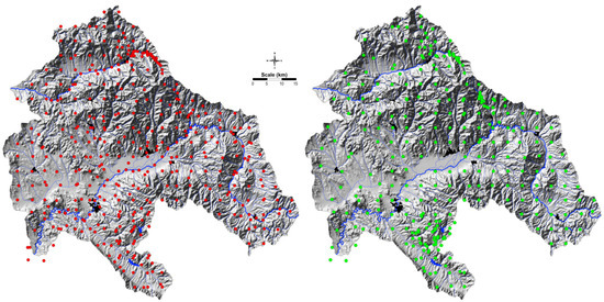 A systematic sampling, using a regular sampling grid for both sampling media, the moss and soil, was applied. The sampling grid for both sampling materials was denser around the mining areas. The entire covered area consisted of 409 samples of soil and 286 moss samples. Regarding soil samples, out of 409 sites, 218 samples were collected from a regular sampling grid of 5 × 5 m; the 126 sampling sites were mostly collected from around the mining areas, and 65 soil samples were collected from alluvial soils. The soil samples were collected from a depth of 0–5 cm (Figure 2). To obtain a representative composite sample, five subsamples were collected at each site in a radius of 50−100 m. The total number of moss samples was 286 (Figure 2). The 195 sampling sites corresponded to the sampling sites collected in a regular grid of 5 × 5 m, while the additional 91 sampling sites were mainly located around mines. To avoid the problem of association with the predicted sampling site due to the presence or absence of selected species, samples of different moss species were taken from the same slope line (Homalotecium lutescens, Hypnum cupressiforme, Pleurozium schreberi and Hylocomium splendens). The interchangeable uses of various species have been demonstrated for the mentioned moss species and were given by Balabanova et al. [31].