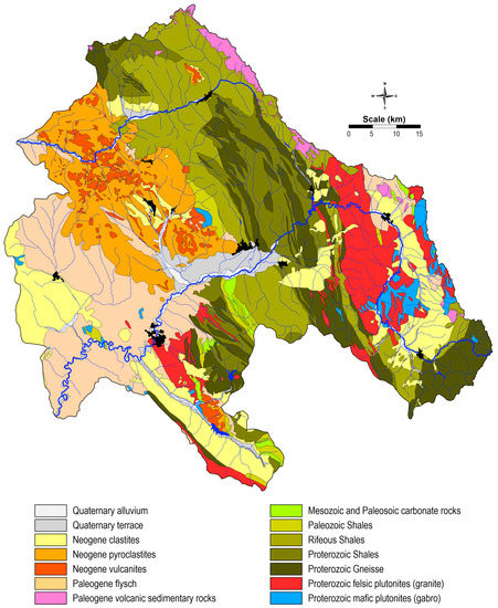 Georeferenced geological maps were then attached to the study area (Figure 3). The main lithological units of the study area were isolated and used in the training dataset [34]. The studied area lies on two main tectonic units—the Serbian–Macedonian Massif and the Vardar Zone [35]—and is characterized by several subvolcanic areas. The polyphasal Neogene deformations play an important role in the development of this area. These deformations, associated with volcanic activity, influence the gradual formation of reefs, as well as the formation of deposits in existing basins, and are associated with alternating periods of fast and slow landslides, which are accompanied by variable deposition from the middle Miocene to the end of the Pleistocene. Cenozoic volcanism represents a more recent extension in the Serbian–Macedonian massive and the Vardar zone. The oldest volcanic rocks occur are the areas of Bučim, Damjan, the Borov Dol district, and in the zone of Toranica, Sasa, Delčevo and Pehčevo [28,32]. These older volcanic rocks were formed in the mid-Miocene from sedimentary rocks that represent the upper age limit of the rocks. The origin of the oldest volcanic rocks is related to the Oligocene—the early-Miocene period.