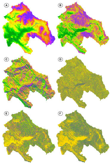 Topographic attributes ((A) altitude above sea level (absolute), (B) terrain slope, (C) aspect (insolation), (D) plan terrain curvature, (E) profile terrain curvature, (F) tangent terrain curvature).