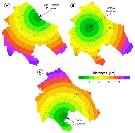 Distances from the main sources of contamination. (A) Sasa–Toranica Pb mine, (B) Zletovo Pb mines, (C) Bučim Cu open pit.
